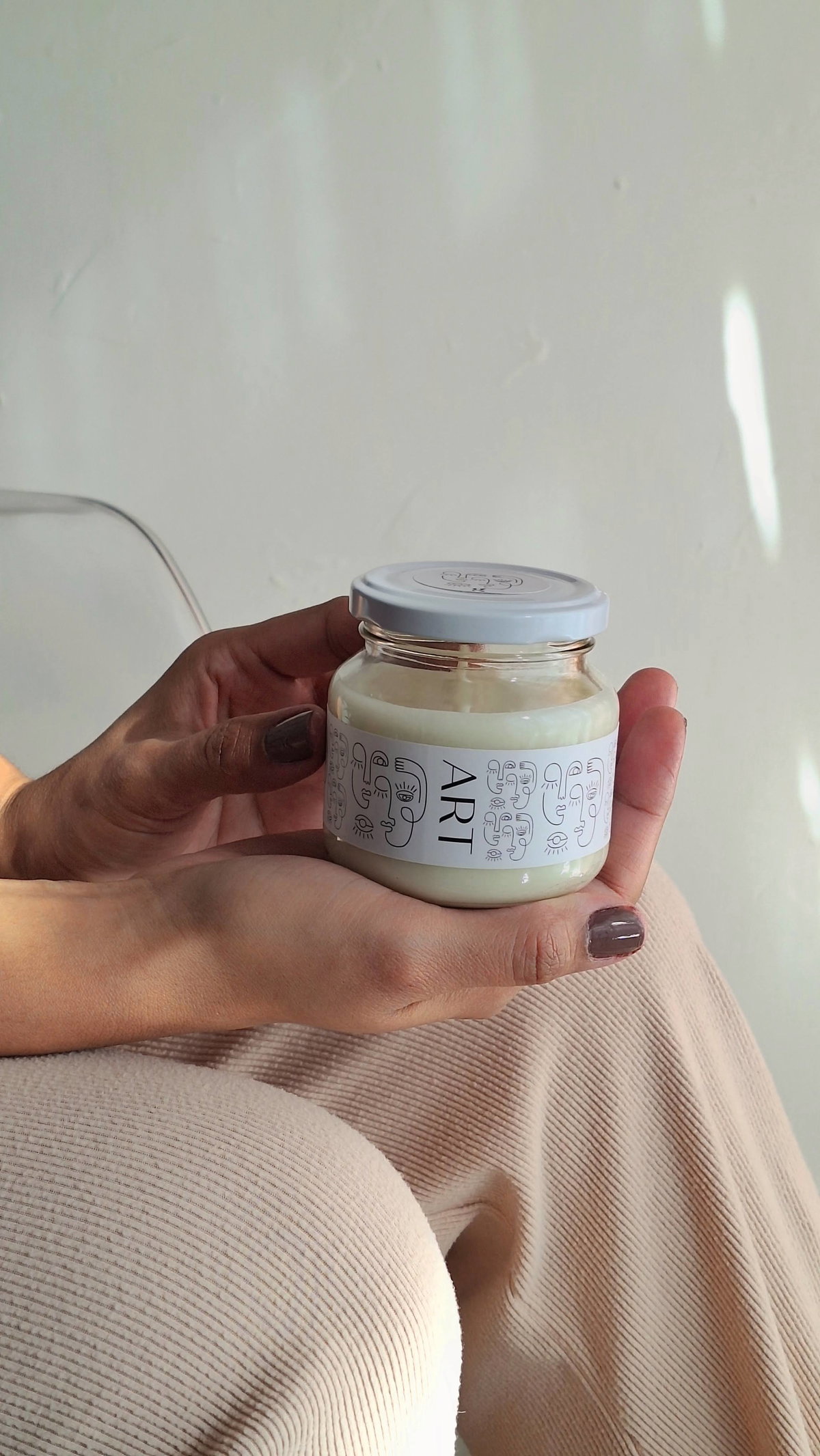 ART combina el aroma de la cera de soja perfumada con un frasco de vidrio y una etiqueta ilustrada de rostros a una línea. Es minimalista, expresiva y perfecta para regalar o sumar arte a cualquier rincón.