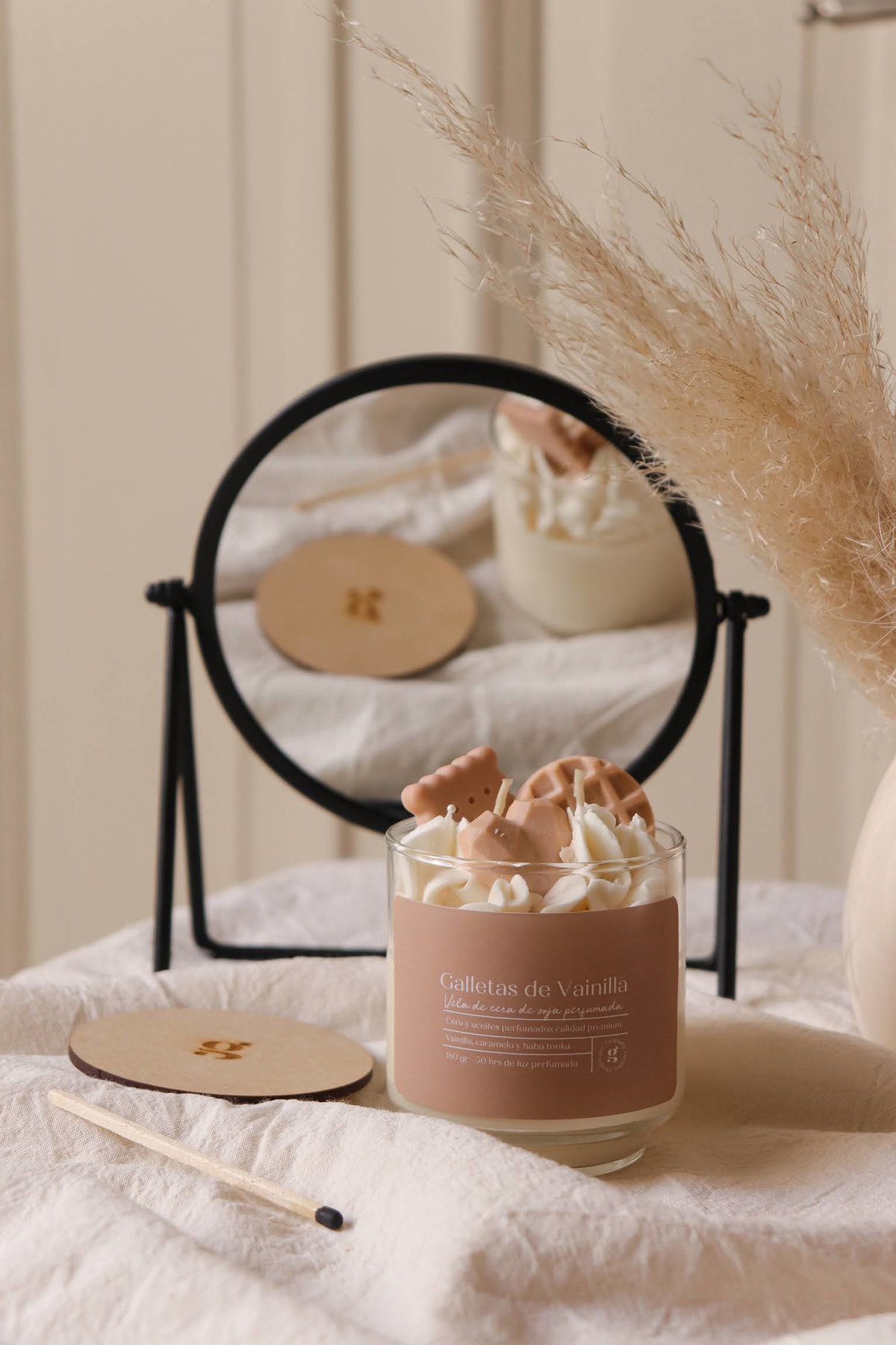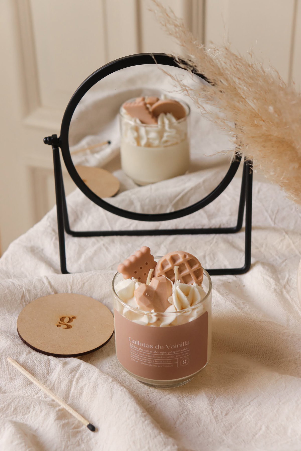 Cada vela es un postre visual y sensorial: vertida a mano en cera de soja, con doble pábilo de algodón, decorado tipo cupcake y una fragancia envolvente.